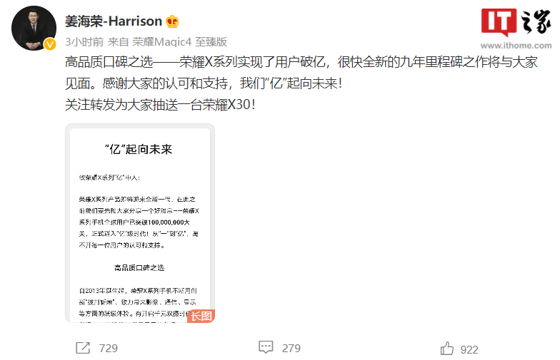 荣耀终端有限公司中国区 CMO 姜海荣今日宣布,荣耀 X 系列手机全球用户突破 1 亿大关,并透露即将发布荣耀 X 系列手机九年里程碑之作。
