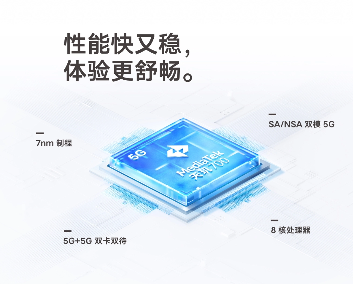 性能方面,vivo Y75s 5G 搭载联发科天玑 700 芯片,该芯片采用 7nm 制程工艺,CPU 由 2 个运行频率 2.2GHz 的核心和 6 个运行频率 2.0GHz 的核心组成,GPU 为 Mali G57。该机配备 8GB / 12GB 的 LPDDR4X 运行内存,256GB 的 UFS2.2 存储,支持最大 1TB micro SD 卡。