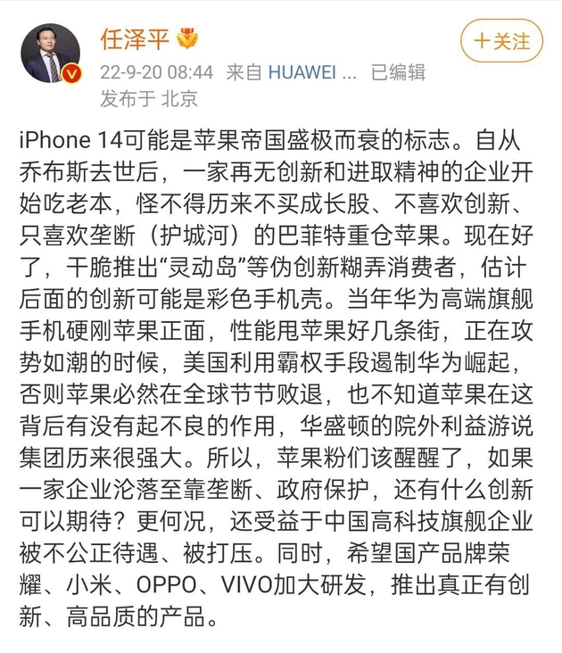 《科创板日报》20日讯,任泽平今日早间发微博称,iPhone 14可能是苹果盛极而衰的标志。他认为,自从乔布斯去世后,苹果再无创新和进取精神,并表示“灵动岛”是伪创新。同时,任泽平称,希望国产品牌荣耀、小米、OPPO、VIVO加大研发,推出真正有创新、高品质的产品。