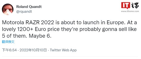 摩托罗拉 moto Razr 2022 折叠屏于今年 8 月在中国推出,但尚未进入国际市场。现在关于新市场售价的信息得以曝光。