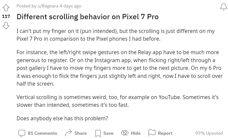据消息,一些 Pixel 7 Pro 用户在 Reddit 上反映,在 Pixel 7 Pro 屏幕上进行滑动操作时感觉不顺畅,有一种“粘滞”的感觉。用户还反映,在打字时,也经常会出现键盘失灵的情况。有用户称,如果屏幕上的内容很长,就会出现滑动不畅的情况。还有用户称,某些应用程序的左 / 右滑动手势也不好用,必须非常大范围地滑动才行。