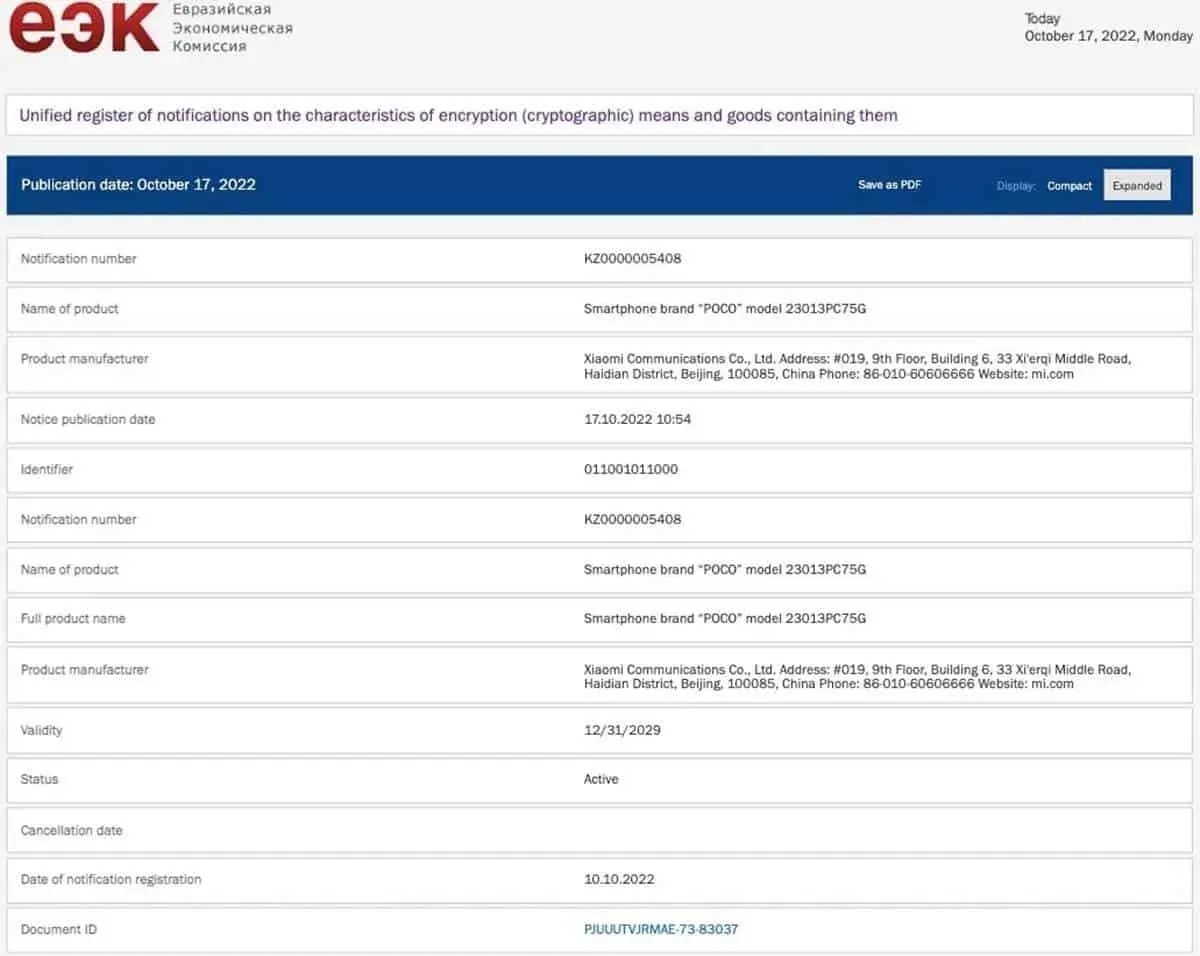 在出现在 IMEI 数据库后,小米的 Poco F5 全球型号已出现在 EEC 认证网站上,型号为 23013RK75G。简而言之,Poco F5 的印度和全球版本已经获得多项认证。预计小米将把 Poco F5 带到多个市场。