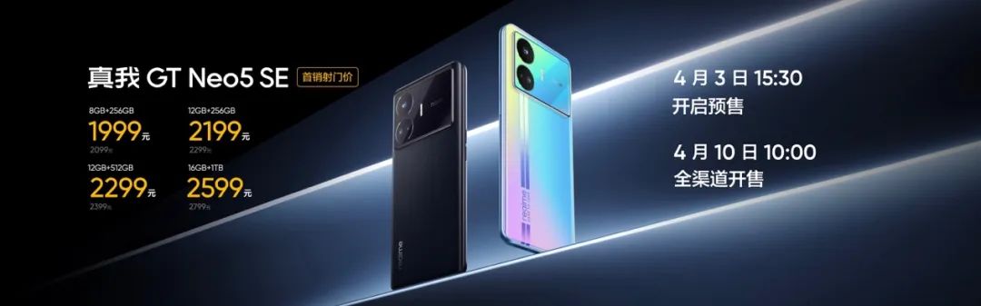 4月3日15:30,真我GT Neo5 SE在真我realme商城、京东、天猫等平台正式开启预售,首销射门价8GB+256GB版本仅需1999元,12 GB +256GB版本2199元,12 GB +512GB版本2299元,16 GB +1TB版本2599元,其中8GB+256GB的版本将在京东平台、真我realme官方商城开售。参与真我GT Neo5 SE预购可享受6期分期免息、30天无忧退换,并且赠送1年延保、1年碎屏保以及价值1400元的游戏礼包,4月10日全渠道正式开售。