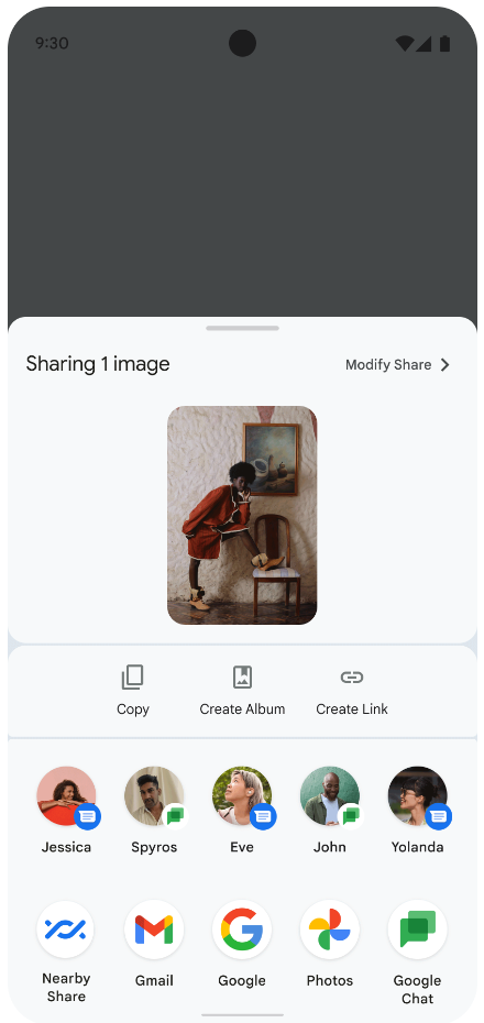 sharesheet 自定义操作,改进排名:Android 14 更新了系统共享页面,以支持自定义应用操作和为用户提供更多信息的预览结果。