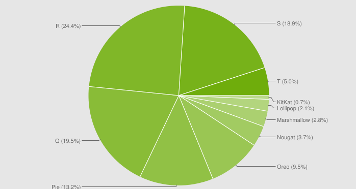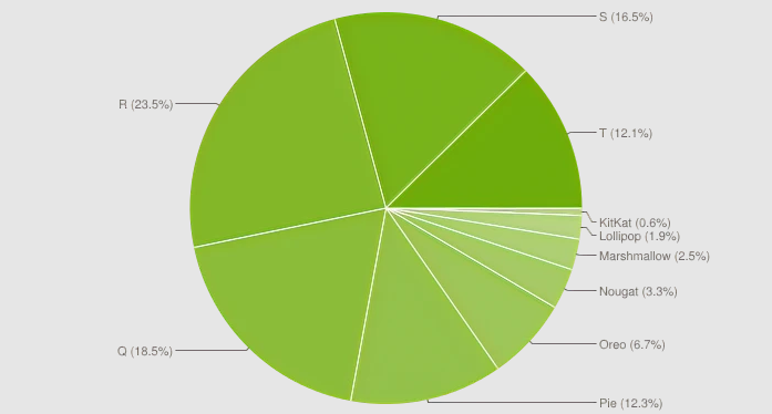 今年 1 月,Android 13首次被添加到图表中,显示自去年 8 月推出以来,该更新已被推广到全球超过 5% 的设备。