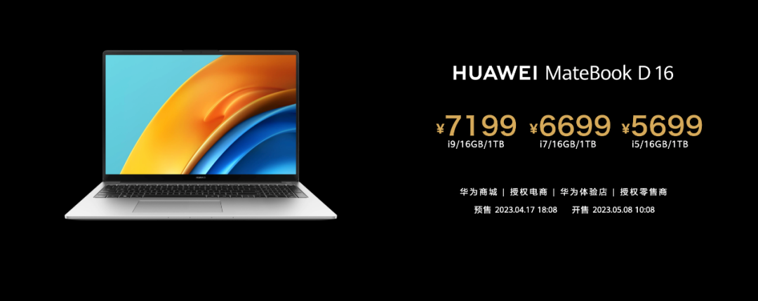 在价格方面,华为MateBook D 16新品i5版本售价5699元,i7版本售价6699元,i9 版本售价7199元,4月17日18:08,华为MateBook D 16新品全系将在华为商城、授权电商、华为实体店以及授权零售商等开启预售,并与5月8日10:08正式开售。届时用户可登陆华为商城、各大授权电商平台及华为实体店进行购买。
