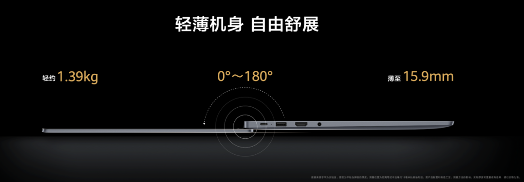 华为MateBook D 14新品机身厚度仅为15.9mm,重量仅1.39kg[6],力求做到同档位中更轻薄小巧的14英寸笔记本,随手拿起,说走就走。