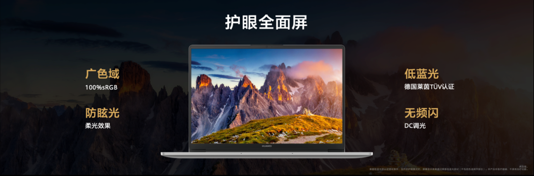好屏幕不仅需要好色彩,而且还需要让用户看着舒服,看着不累。华为MateBook D 14的屏幕获得德国莱茵TüV低蓝光认证[9]可以减少部分有害蓝光辐射,使得高辐射波段的蓝光亮度能量低于屏幕亮度总能量的20%[10]。同时也使用了DC调光无频闪技术,让眼睛舒适感光,呵护用户的双眼。