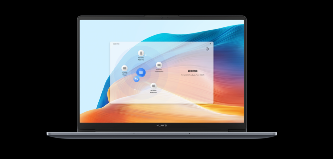 华为MateBook D 14新品支持超级终端带来的简单且便捷的连接方式,用户只需要点击右下角的控制中心,进入超级终端界面,“一拉即合”就可以实现与适配的华为手机、平板、显示器、智慧屏等不同设备的互联。