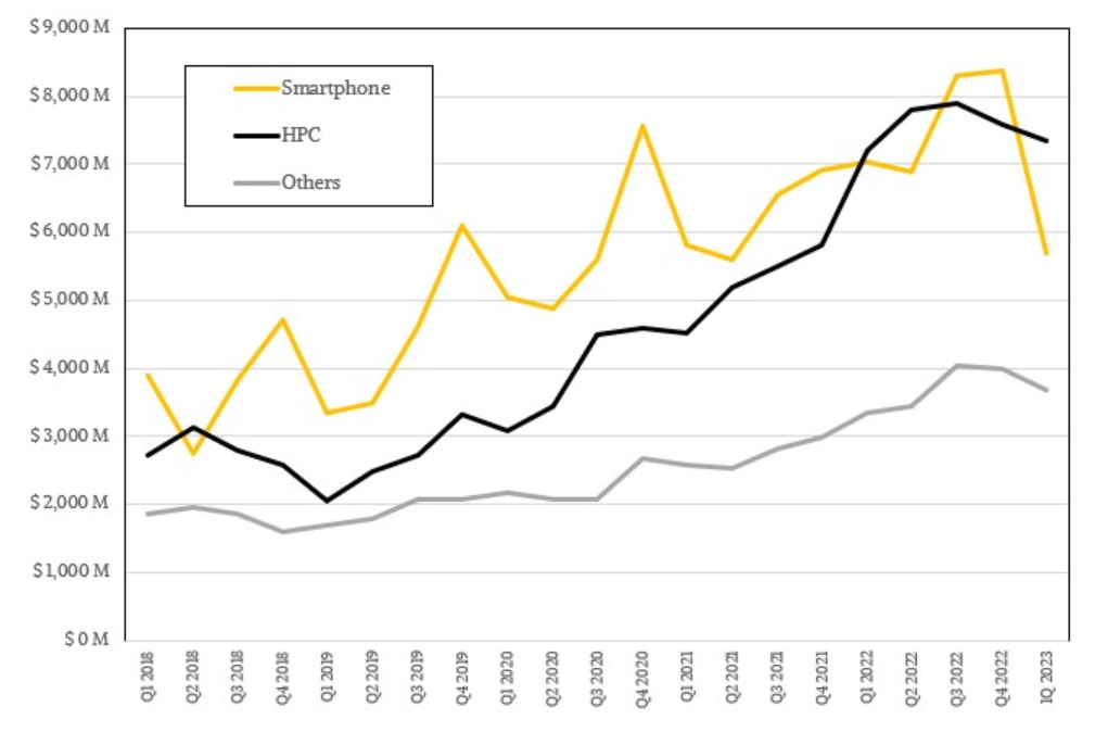 当然,原因在于台积电拥有全球最先进的计算引擎代工厂。而令台积电元气大伤的是智能手机销量和个人电脑芯片销量的迅速下滑,属于台积电称之为“高性能计算”(HPC)的范畴,但我们可能会称之为中央处理器(CPU)、图形处理器(GPU)、现场可编程逻辑门阵列(FPGA)和定制专用集成电路(ASIC)。