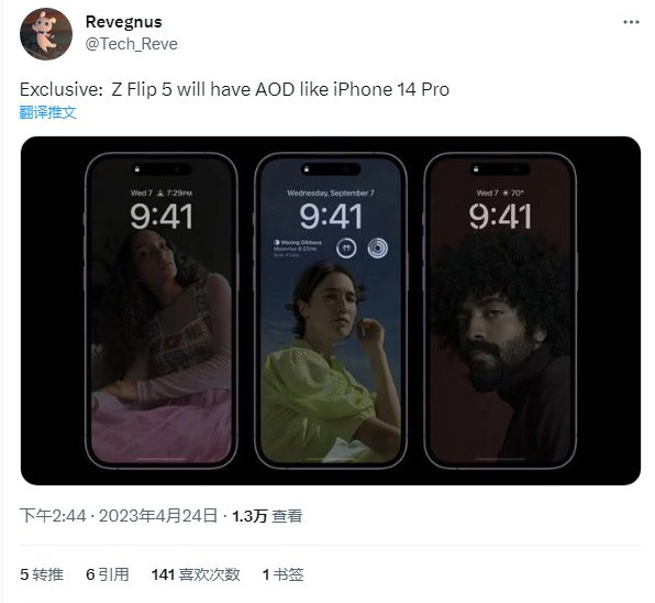 这条消息源来自 @Tech_Reve,推文中表示 Galaxy Z Flip 5 手机将具有与 iPhone 14 Pro和 Pro Max 相同的全屏 AOD 特性。