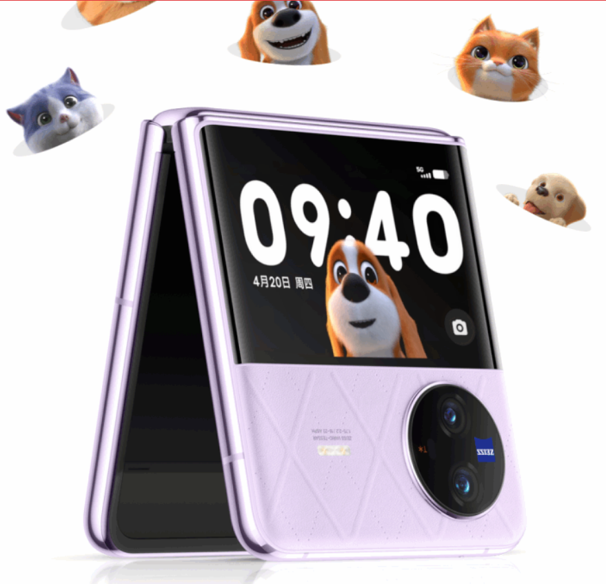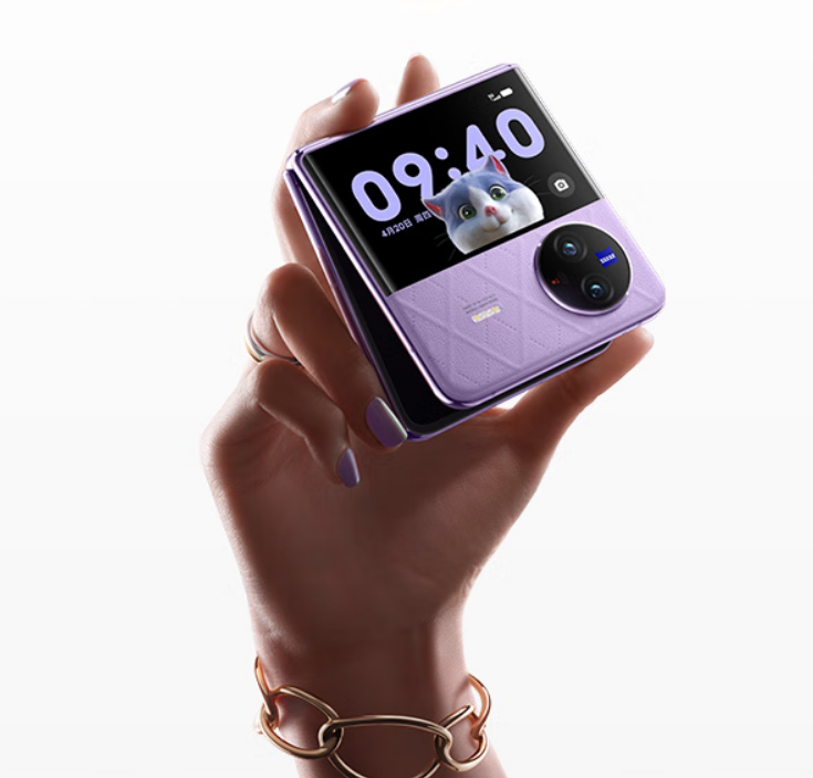 vivo X Flip 提供菱紫、绸金、钻黑 3 款配色可选,外屏选用 3.0 英寸的 AMOLED 显示屏,覆盖肖特赛绚 α 玻璃,可适配 30+ 应用,包括抖音、小红书等。内屏选用一块 6.74 英寸的 AMOLED 显示屏,支持 120Hz 刷新率和 1920Hz PWM 高频调光。该机同样采用自研水滴铰链,支持多角度悬停。