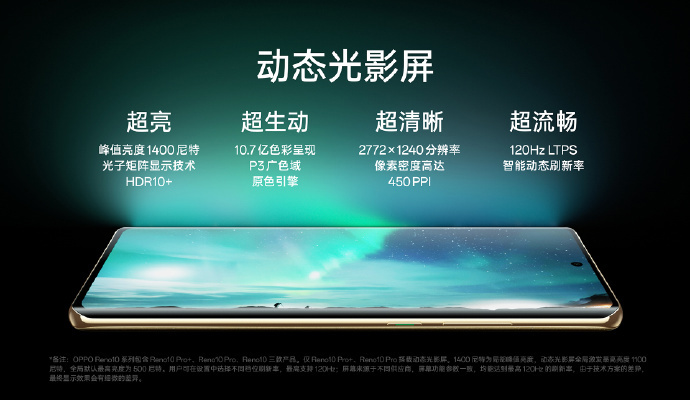 屏幕方面,OPPO Reno10 采用 6.7 英寸 2412×1080 居中单孔 OLED 曲屏,支持 120Hz 刷新率,峰值亮度 950nit,支持 10.7 亿色显示;Pro+ 和 Pro 版本搭载 Find 系列同款动态光影屏,为 6.74 英寸 2772×1240 居中单孔 OLED 曲屏,支持 120Hz 刷新率,峰值亮度 1400nit,支持 10.7 亿色显示,Pro XDR 显示。