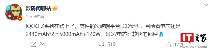 据博主 @数码闲聊站 爆料,iQOO Z 系列新机预计搭载高性能次旗舰平台,配备 LCD 显示屏,内置 5000mAh 电池,支持 120W 快充,并且采用充电速度较快的 6C 双电芯。