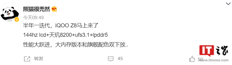 另一位博主 @熊猫很禿然 则明确指出,半年一迭代的 iQOO Z8 手机将配备支持 144Hz 刷新率的 LCD 显示屏,搭载天玑 8200 处理器、UFS 3.1 ROM 以及 LPDDR 5 RAM,并且会提供大内存版本。