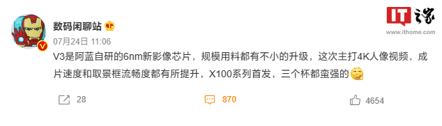 另据微博博主 @数码闲聊站 爆料,V3 影像芯片的规模用料都会有不小升级,将于 X100 系列新机首发。功能方面,此次将“主打 4K 人像视频,成片速度和取景框流畅度都有所提升”。