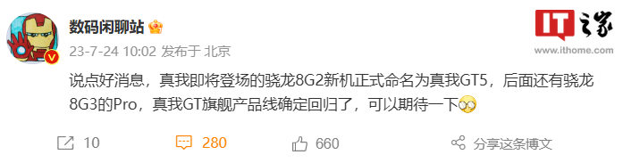 据博主 @数码闲聊站 还爆料,realme 即将推出的骁龙 8 Gen 2 新机被正式命名为真我 GT 5,Pro 版预计搭载骁龙 8 Gen 3 处理器。