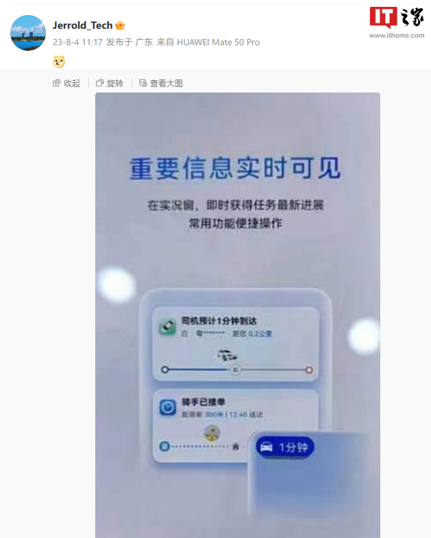 另外据数码博主 @ Jerrold_Tech 消息,“实况窗”功能的大致界面也已经得到曝光,提供左上角图标提示、锁屏界面常驻通知等多种消息实时提醒形式。