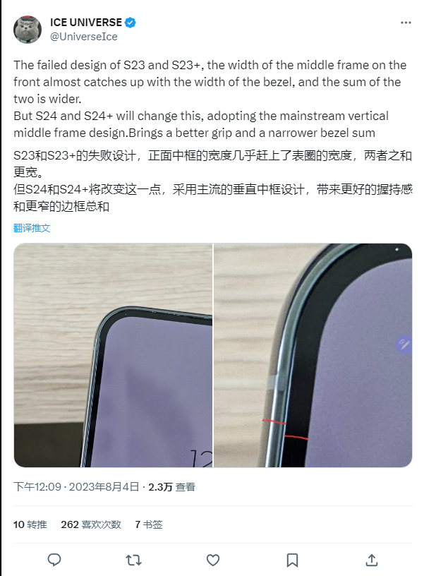 i 冰宇宙在后续的推文中还表示,三星 Galaxy S23 和 Galaxy S23+ 两款手机的失败之处在于屏幕边框的厚度几乎赶上了边框的厚度,而两者之和让手机看起来边框很厚。
