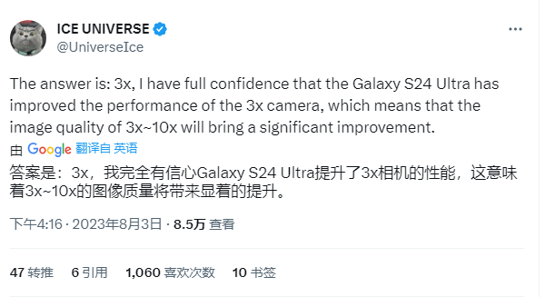 i 冰宇宙在随后的自问自答中表示答案是 3x 长焦镜头。他表示完全有信心看到三星升级 3x 长焦镜头的性能,在 3x-10x 变焦上带来显著的提升。
