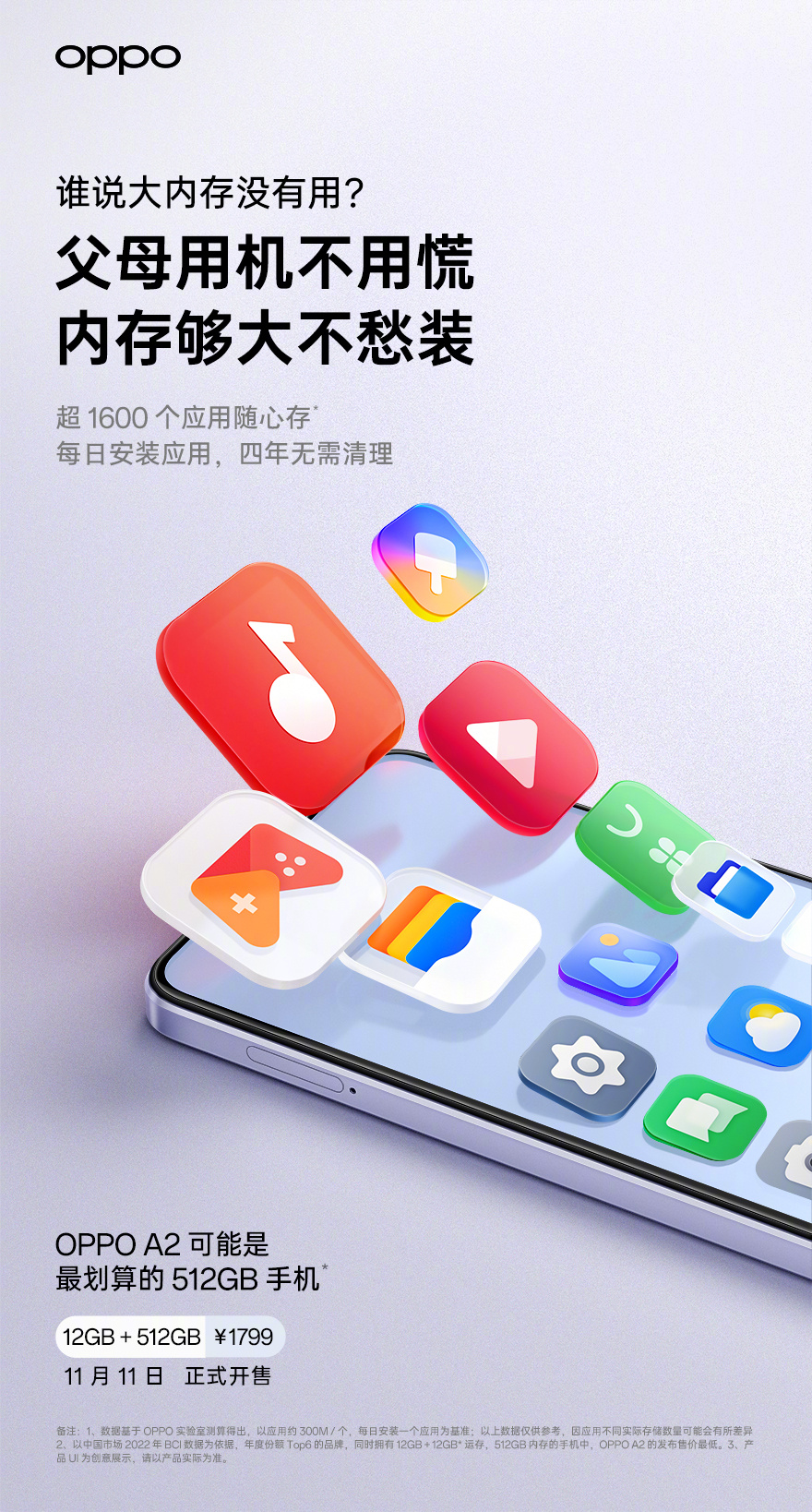 OPPO 官方今日宣布推出了 OPPO A2 手机的 12GB + 512GB 版本,首发价 1799 元,11 月 11 日正式开售。OPPO 官方表示,这可能是最划算的 512GB 手机。