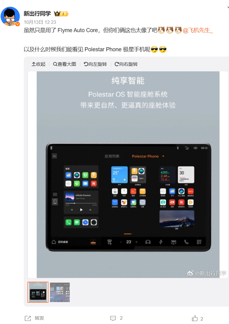 另据 @新出行同学 消息,该手机可以搭配极星汽车,运行 Polestar OS 智能座舱系统,从 UI 界面来看,与魅族 Flyme 确实有点像。