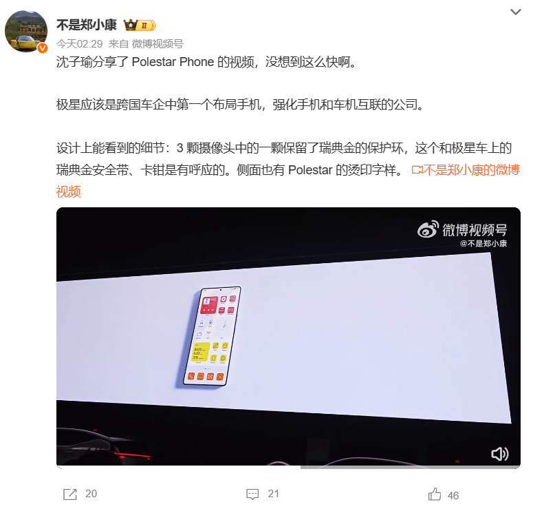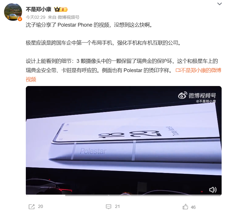 从视频可以看到,这款手机整体采用了类似魅族 20 系列的设计,背部为极星 Logo,3 颗摄像头中的一颗保留了瑞典金的保护环,保留了汽车的设计风格,机身侧面则是 Polestar 的品牌名称。