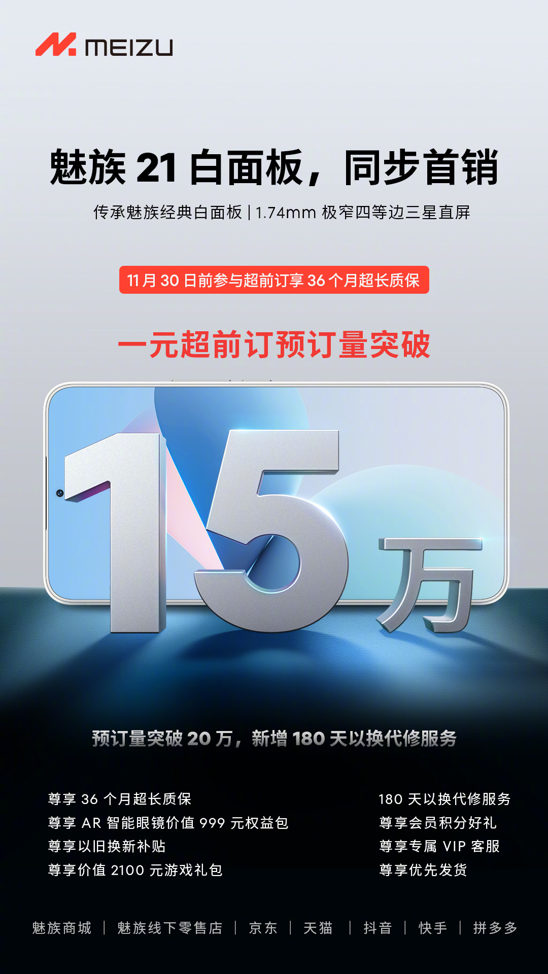 魅族官方宣布,魅族 21 超前订突破 15 万,一元超前订预订量突破 20 万将新增 180 天以换代修服务。