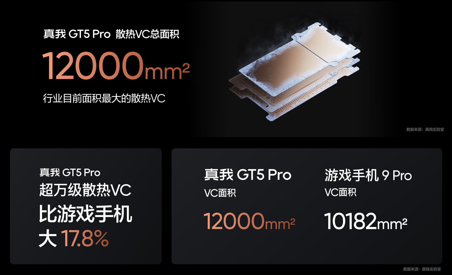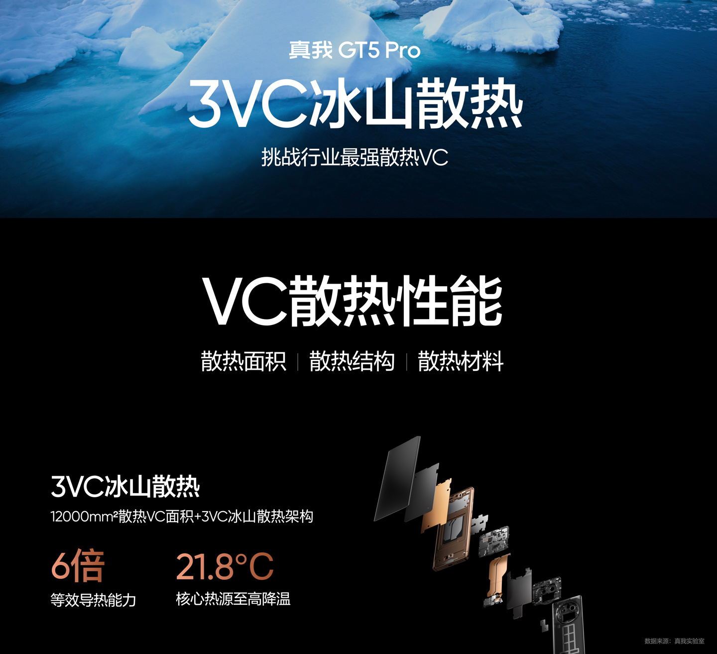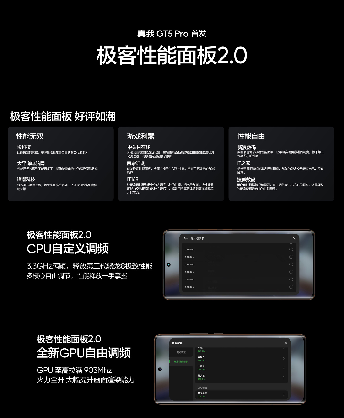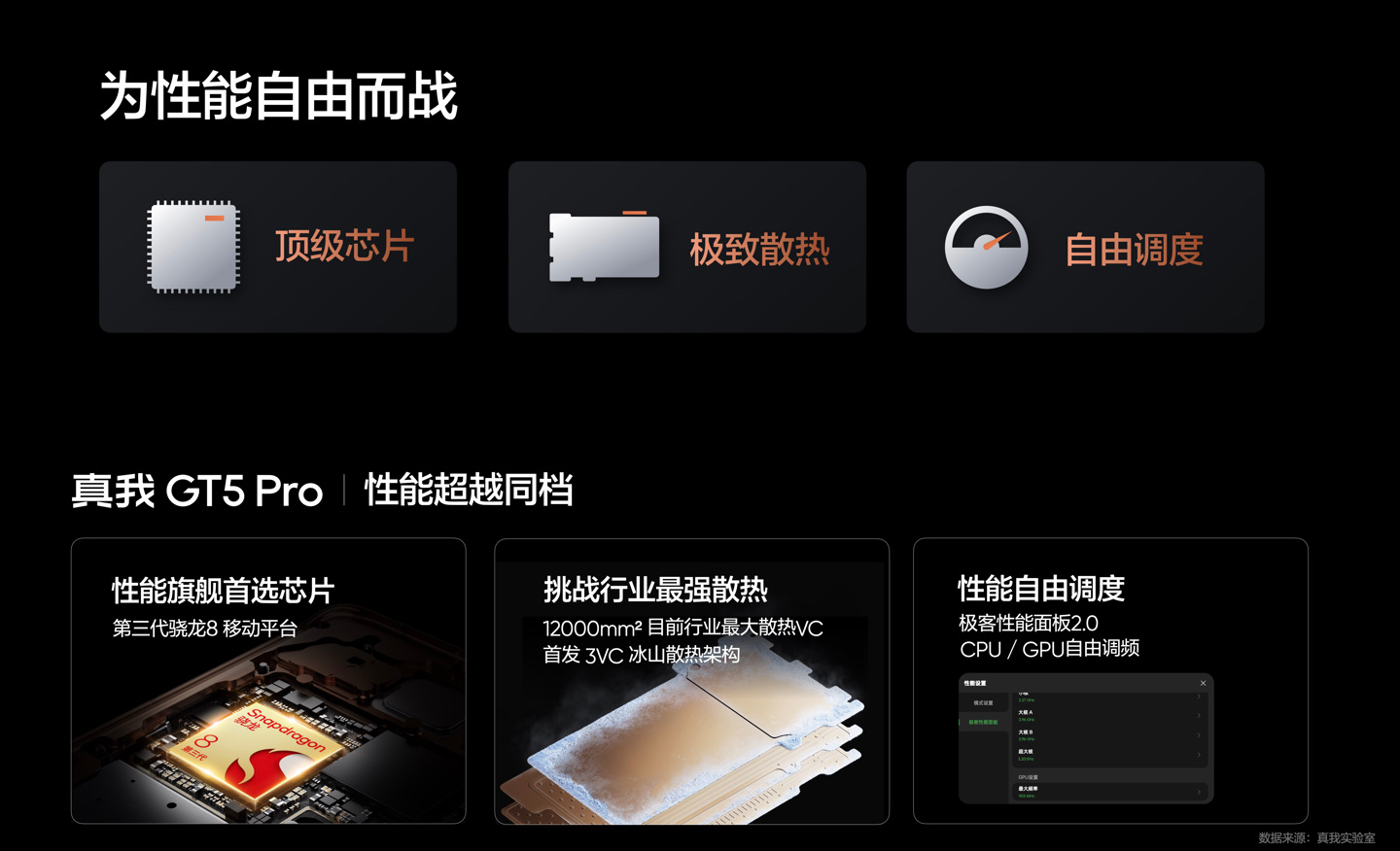 性能方面,真我 GT5 Pro 搭载第三代骁龙 8 处理器,采用 3VC 冰山散热系统,面积达到 12000mm2,拥有 6 倍等效导热能力。此外还首发极客性能面板 2.0,首次开放 GPU+CPU 双调度。