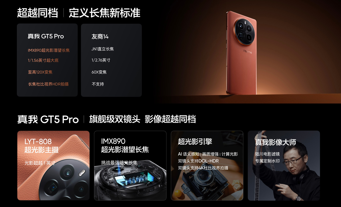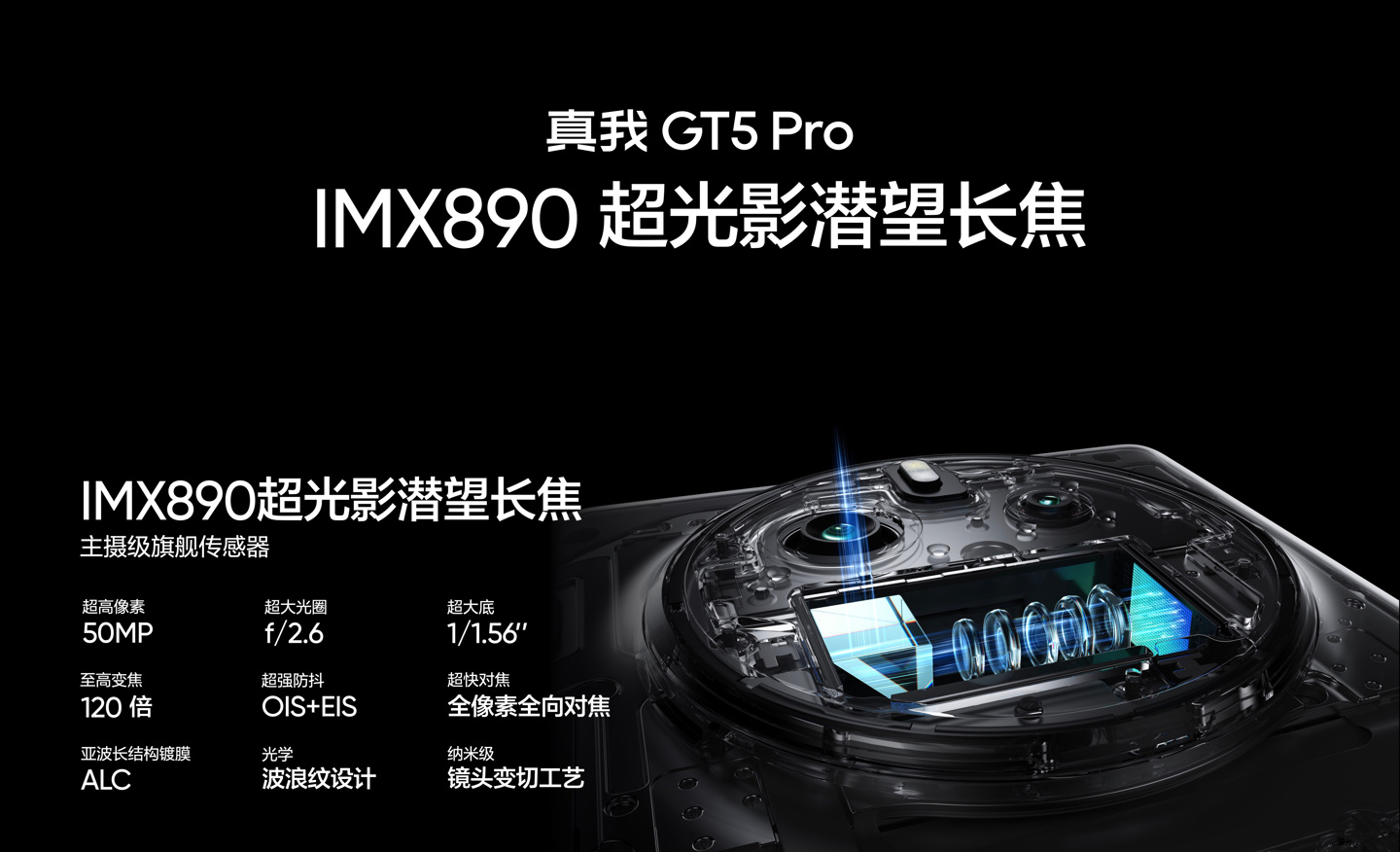 真我 GT5 Pro 还联合高通和虹软首发超芯长焦影像系统,搭载 IMX890 超光影潜望长焦,拥有主摄级旗舰传感器,号称挑战行业最大底潜望长焦,支持 3X 光学变焦、6X 无损变焦、长焦特写、暗光长焦人像,新机还是安卓首款长焦和主摄均支持杜比视界 HDR 拍摄,至高支持 4K 格式。