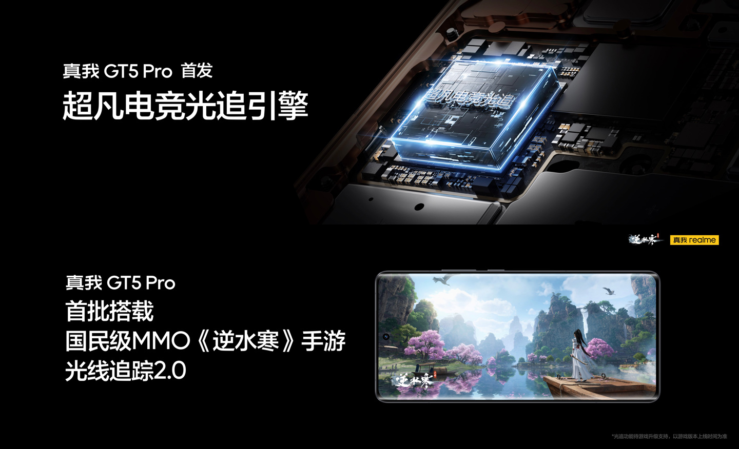 真我 GT5 Pro 首发超凡电竞光追引擎,首批支持《逆水寒》手游光踪 2.0。支持游戏专属内存 Pro、2160Hz 电竞触控引擎、行业首创隔膜触控模式优化屏幕断触 &边缘触控、燃模式适配主流散热背夹。