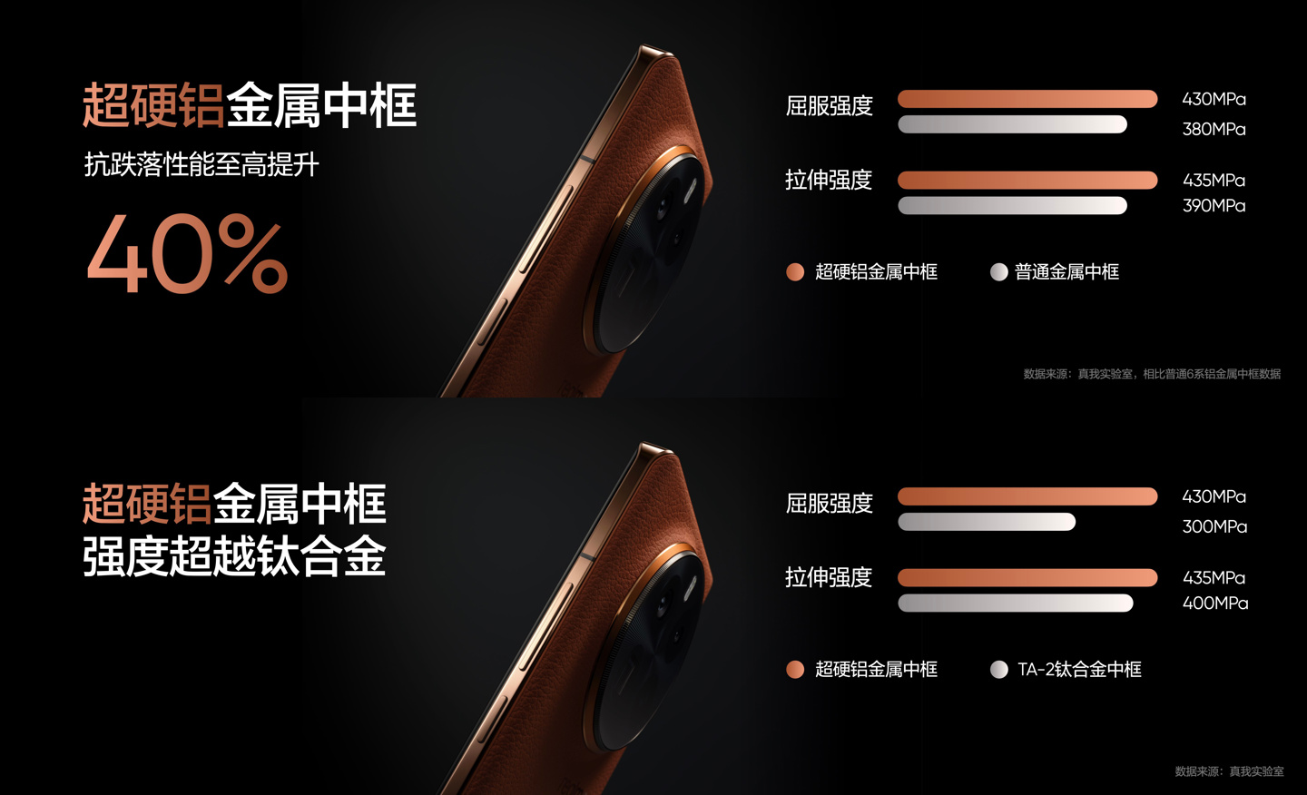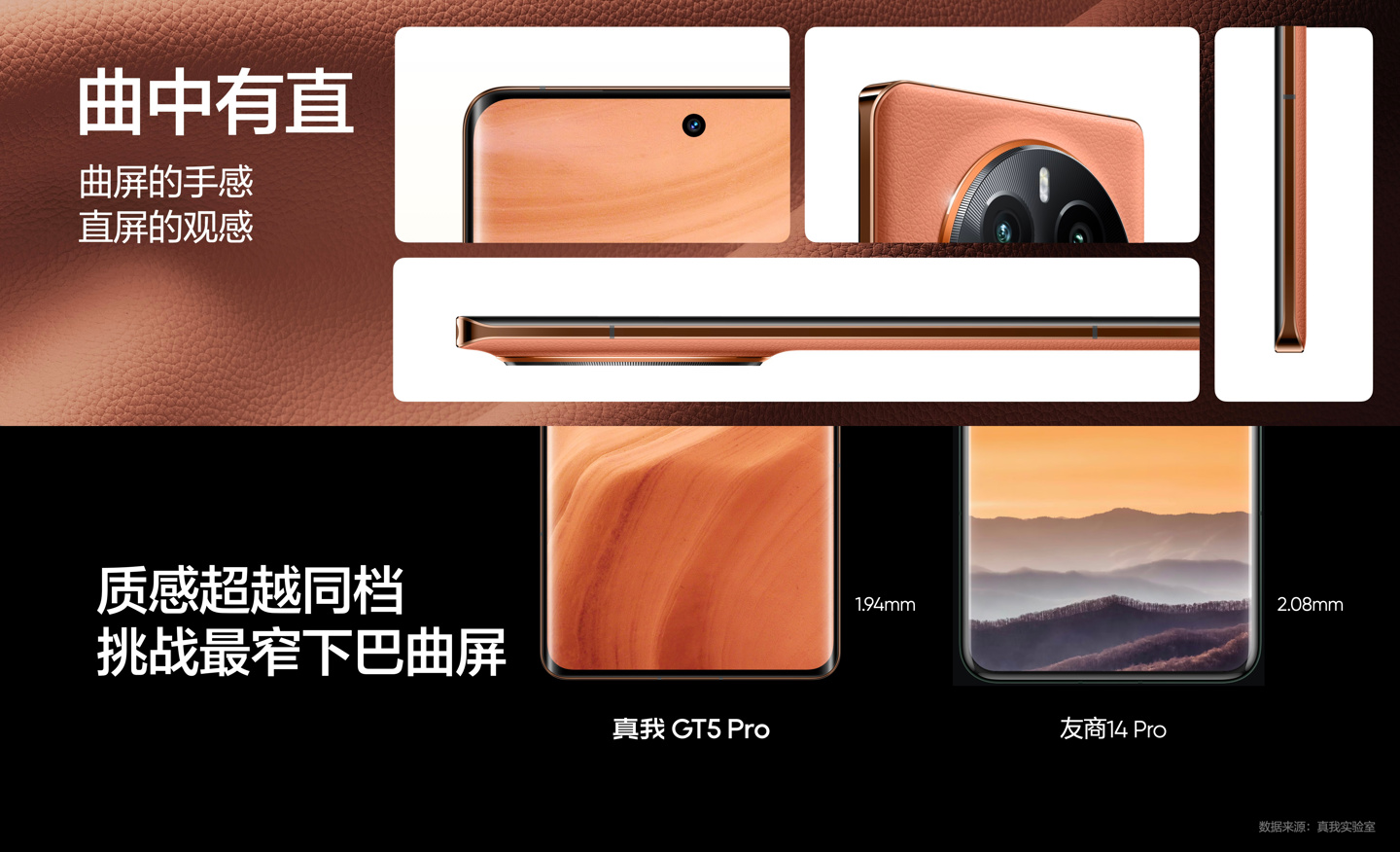 外观方面,真我 GT5 Pro 采用星耀光轨镜头设计,行业首创超硬铝金属中框,官方称强度超越钛合金。屏幕曲中有直,官方称既有直屏观感、又有曲屏手感,下巴宽度仅 1.94mm,号称挑战曲屏最窄下巴。