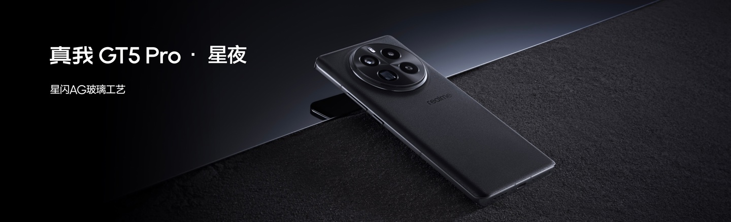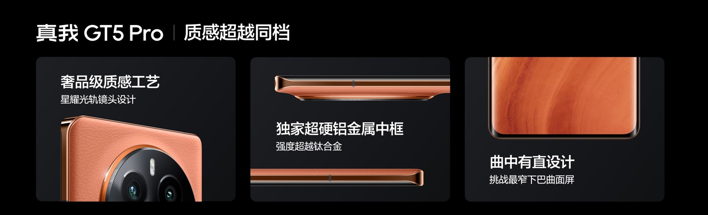 真我 GT5 Pro 提供三款配色,其中「赤岩」和「皓月」配色采用高阶科技纳米皮,超 50 万次耐磨,手感亲肤更耐磨;「星夜」配色采用星闪 AG 玻璃工艺,光影如繁星点点。