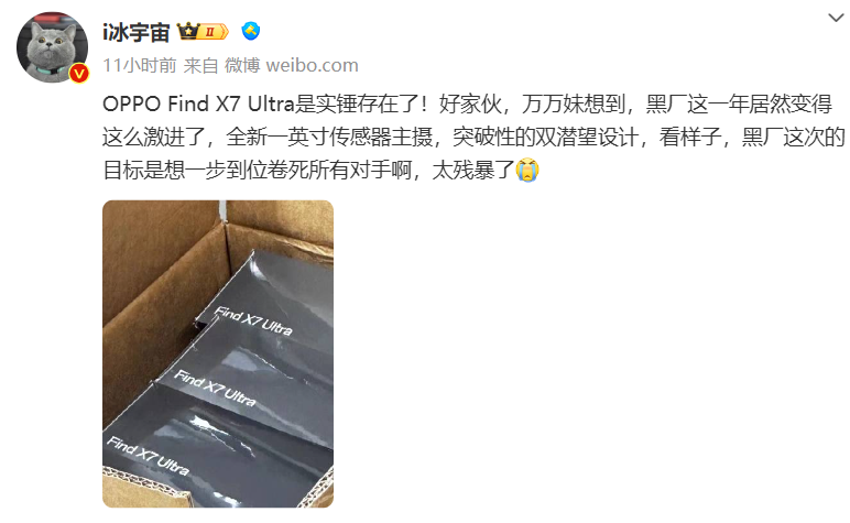值得一提的是,博主 @i 冰宇宙 昨晚(12 月 18 日)放出了一张关于 OPPO Find X7 Ultra 包装盒的实拍照,进一步证实了这款超大杯机型的存在。