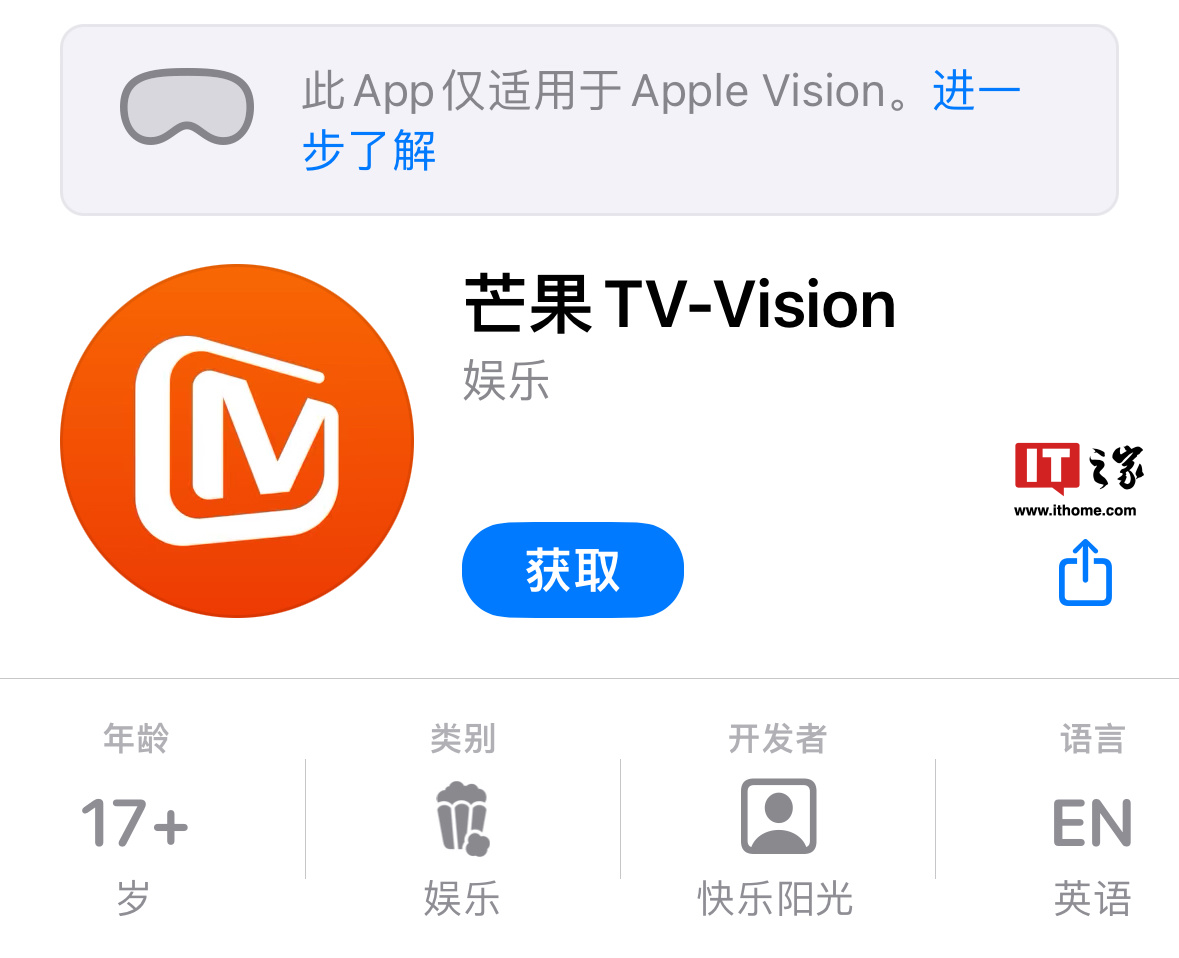 芒果 TV 近日悄然为苹果 Vision Pro 头显推出了一款独立原生应用“芒果 TV-Vision”,目前相关应用已经上架苹果 App Store,已经拥有 Vision Pro 的小伙伴可以点此下载测试体验。