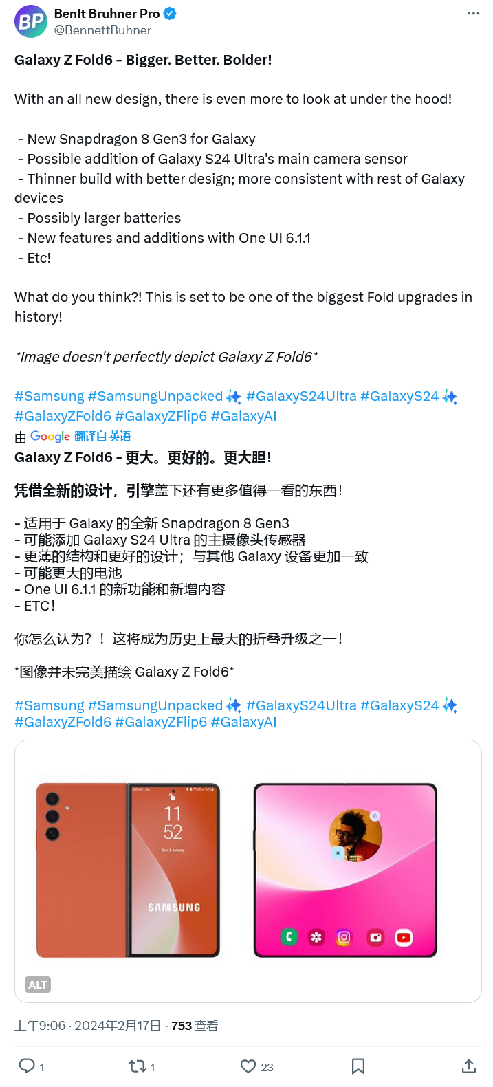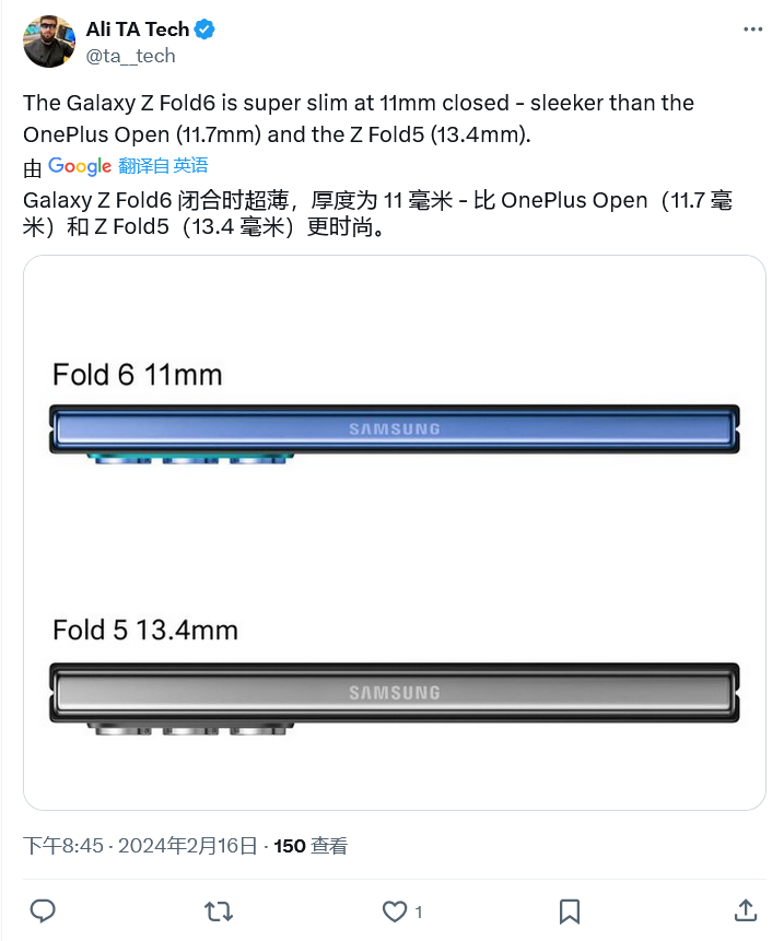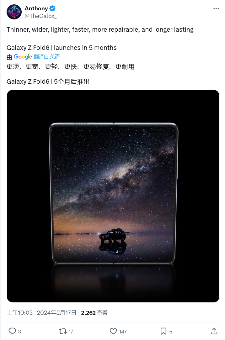 消息源 @TheGalox_近日发布推文,表示三星会提前至今年 7 月发布 Galaxy Z Fold6 手机,其变化是“更薄、更宽、更轻、更快、更易修复、更耐用”。