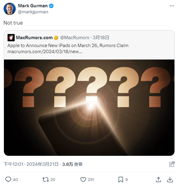 因此,有传闻称苹果 2024 款 iPad Air / Pro 平板电脑有望 3 月 26 日发布,不过彭博社马克 古尔曼(Mark Gurman)则直言这种说法“不实”。