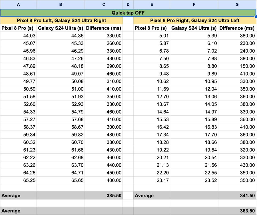 从结果来看,Galaxy S24 Ultra 平均要比 Pixel 8 Pro 慢三分之一秒,有时甚至会慢上半秒。
