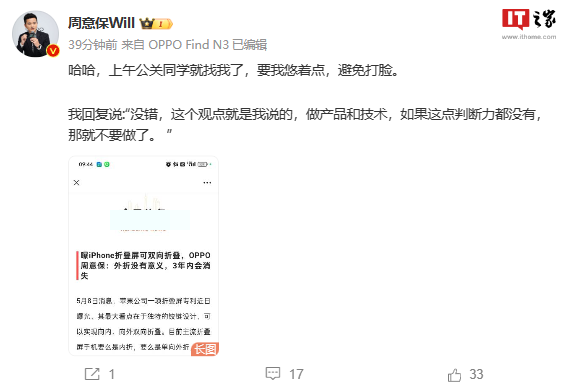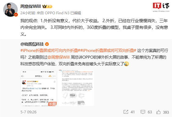 周意保今日再次对自己发表的观点进行了确认,同时配图苹果 iPhone折叠屏专利新闻。