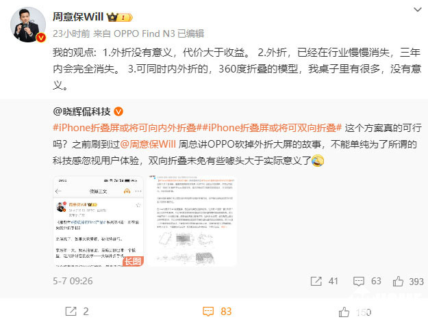 OPPO Find系列产品负责人周意保Will表示,1.外折没有意义,代价大于收益。2.外折已经在行业慢慢消失,三年内会完全消失。3.可同时内外折的,360度折叠的模型,我桌子里有很多,没有意义。