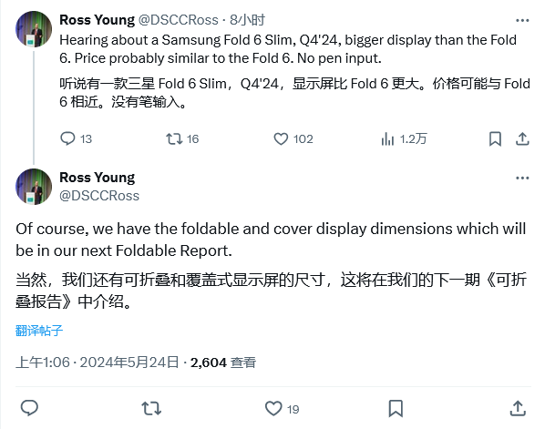 屏幕供应链咨询公司 DSCC 首席执行官罗斯 杨(Ross Young)今天发布推文,表示三星正在开发 Galaxy Z Fold6 Slim 产品,计划 2024 年第 4 季度发布。