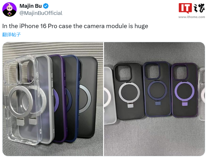 此外,爆料人 Majin Bu 也放出了号称是 iPhone 16 Pro 的保护壳,表示“镜头模组很大”,而在保护壳一侧同样能看到新的开孔。