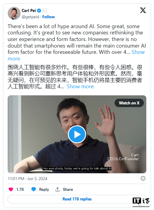 Carl Pei 表示,与当今大多数厂商热衷于宣传各种 AI 功能不同,Nothing 并不会在下个月发布新机并大肆宣扬其 AI 特性。相反,他们选择花更多的时间来“重新定义用户界面,在智能手机系统层面整合 AI,从而带来高度个性化和动态的用户体验”。