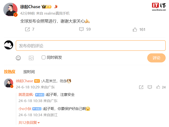 真我 realme 副总裁、全球营销总裁徐起今日发文对此事进行了回应,他表示“全球发布会照常进行,谢谢大家关心”。