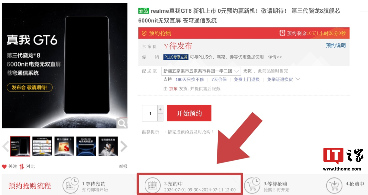 realme 真我 GT6 手机目前已上架京东,参考商品页,该机搭载骁龙 8 Gen 3 芯片,配备 6000 尼特无双直屏,同时搭载“苍穹通信系统”,商品页“预约抢购流程”显示该机有望于 7 月 11 日发布。