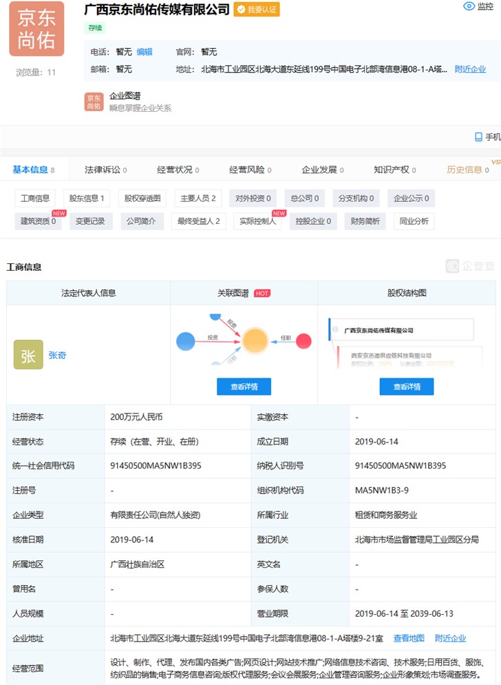 据企查查数据显示,在6月14日,广西京东尚佑传媒有限公司正式成立,注册资本200万元,法定代表人为京东的001号员工张奇。