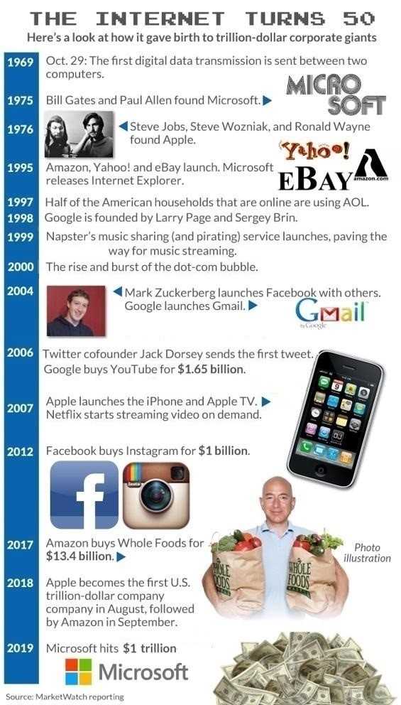 2019年10月29日是世界互联网诞生50周年纪念日。半个世纪过去了,互联网会给世界带来哪些变化呢?如今,苹果公司、亚马逊公司以及微软公司的市值已经如破了1万亿美元。