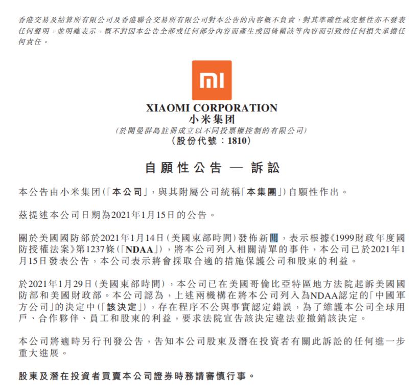 C114讯 2月1日消息(颜翊)昨晚,小米集团在港交所发布公告称,公司已于美国东部时间1月29日在美国哥伦比亚特区地方法院起诉美国国防部和美国财政部。