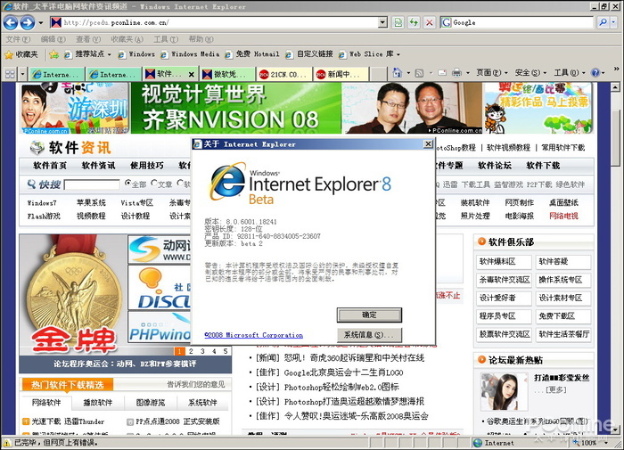 2009年发布的IE8是微软首款支持64位下载的浏览器软件带来了WebSlices(网页切片)、彩色标签、加速器、智能地址栏、域名高亮、可视化搜索、自动标签崩溃恢复、InPrivate隐私浏览等一系列新功能还有就是为了网页兼容而特地设置的兼容性按钮。