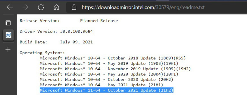在 DCH GPU 驱动程序 30.0.100.9684 的发行说明中,英特尔明确将 Windows 11称为“2021 年 10 月更新 - 版本 21H2”